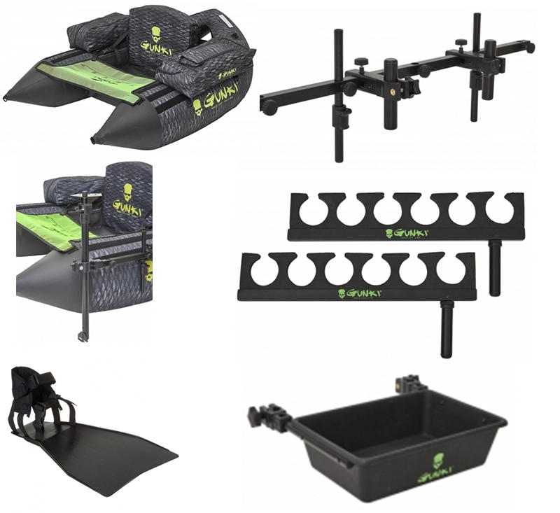 Gunkin paras kelluntaputki kaikilla lisävarusteilla!Kelluntaputki Squad:Virtaviivaisen V-muotonsa, mukavan istuimensa ja erinomaisen kelluvuutensa ansiosta tämä kelluntaputki tekee vedessä liikkumisesta helppoa!Erittäin vakaa, joten pääset nopeasti parhaille kalapaikoille. Se on uskomattoman ketterä mutta silti huomaamaton vedessä. Viimeistelty camo-kalan väriseksi ylimääräistä hienovaraisuutta varten. Irrotettavat tarrakiinnitteiset heijastavat turvanauhat.Sisältää:• Gunki medium-tasku (x1)• Gunki Team-tasku (x1)• Korjaussarja• Kuljetushihnat• Jalkajousipumppu• Vavan raapaisu (x2)• Säilytyspussi• Heijastavat turvanauhat (3)Tekniset tiedot: 145kg• Paino taskujen kanssa: 6,2kg• Kelluva turvaistuin korkeatiheyksisestä vaahtomuovista, jossa säädettävät hihnat selkänojaa varten• Pohja Cordura 100D-kankaasta minimaalisen vedenkestävyyden ja lisävahvuuden takaamiseksi• Irrotettavat ja uudelleen aseteltavat turvataskut• Lukuisia kiinnitysrenkaita• Erilaisia säilytysmahdollisuuksia (verkkotasku selässä, pullonpidike/sauvatuki..)• Säilytystila selässä• Virtaviivainen V-muoto• Kantokahva• Irrotusmatto mittauksineen Kaikuluotainkiinnike 58cm:Soveltuu Gunkis tarvikepalkin etuosaan. Voit helposti asettaa sen pystysuoraan täydellistä asennusta varten.Gunki Accessory Bar 80cm:Soveltuu helposti ja turvallisesti Gunki vatsaveneen oikealla tai vasemmalla puolella oleviin renkaisiin. Tämä hallitsee kaikkia Gunkin kelluntatuubin tarvikkeita.Sauvojen pidikesarja 33,5cm:Sauvojen pidikkeet Gunkin vatsaveneisiin. Voidaan asentaa mihin tahansa Gunkis tarviketangon varrelle tai tarviketangon jalkoihin ruuvattaviin ruuveihin. Vapapidikkeessä on 6 kpl 40mm aukkoja.Sivutarjottimen kulho 34x9x23cm:Erittäin käytännöllinen apuväline Gunki vatsaveneeseensä. Sopii myös Gunkin tarviketankoon.Lyhyt airo Fenor 24x45cm:Lyhyet evät, joissa on suuret terät, täydelliset tarkkaan ja sujuvaan manöövereihin väsymättä liikaa. Suunniteltu vatupassikalastukseen, yleispätevä. myydään tietenkin pareittain.