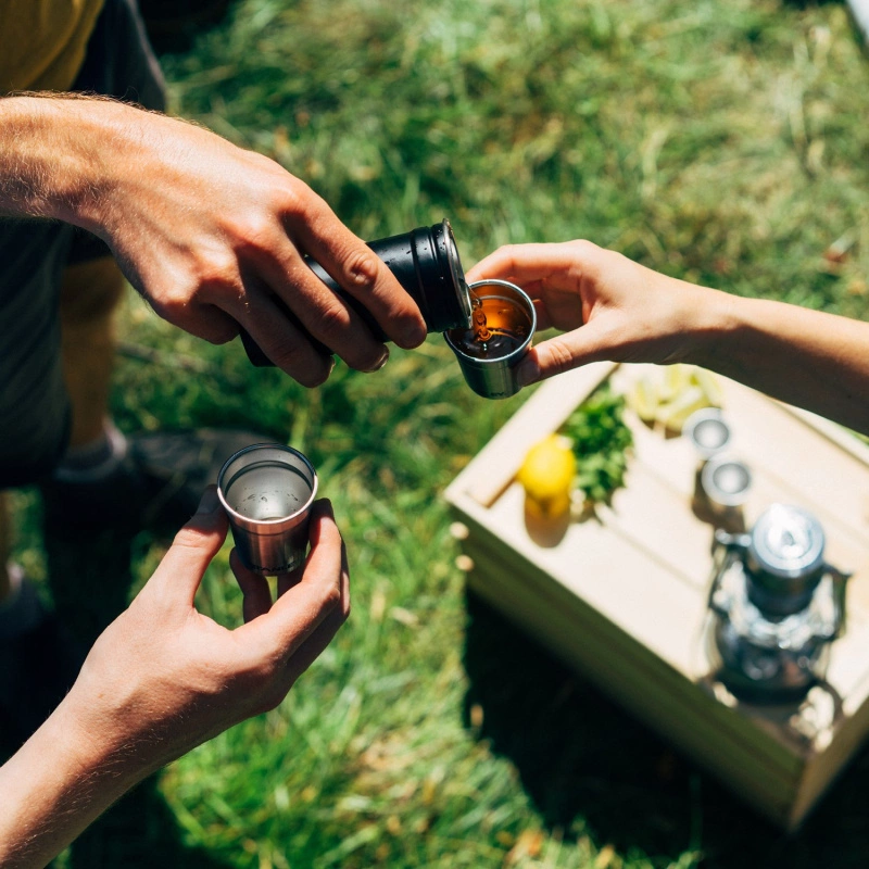 Elokuvat puistossa. Pitkät pyöräretket. Musiikkifestivaalit. Vuorten valloittaminen. On niin monia paikkoja, joihin voit viedä tämän sarjan. Ruostumattomasta teräksestä valmistetut shottilasit asettuvat siististi kantokotelon sisään, eivätkä ne mene rikki, vaikka pudottaisit ne. Ohuessa 8 oz. pullossa on tarpeeksi tilaa täyttää kaikki neljä shottia, ja se mahtuu silti helposti pieneen laukkuun tai reppuun.18/8 ruostumatonta terästä, BPA-vapaapesujärjestelmäVain käsienpesuSetti sisältää:Shot-lasit (2 OZ / 59 ML)Ruostumattomasta teräksestä valmistettu kantokoteloKannatuskannatinPullo (8 OZ / 0,32 L)Paino: 498 g/li>Koko: 2 OZ / 59 ML: 9,9L x 2,8W x 7,1H in.