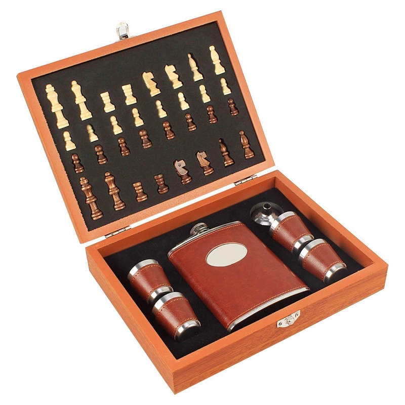Matkalaukku on valmistettu lakatusta puusta ja sen sisällä on samettivuori. Matkalaukku sulkeutuu salvoilla ja siinä on kätevä kahva. Pullo ja lasit on valmistettu ruostumattomasta teräksestä ja päällystetty keinonahalla.Sisäpuoli:1 lonkkapullo4 shottilasiaSuppilo.